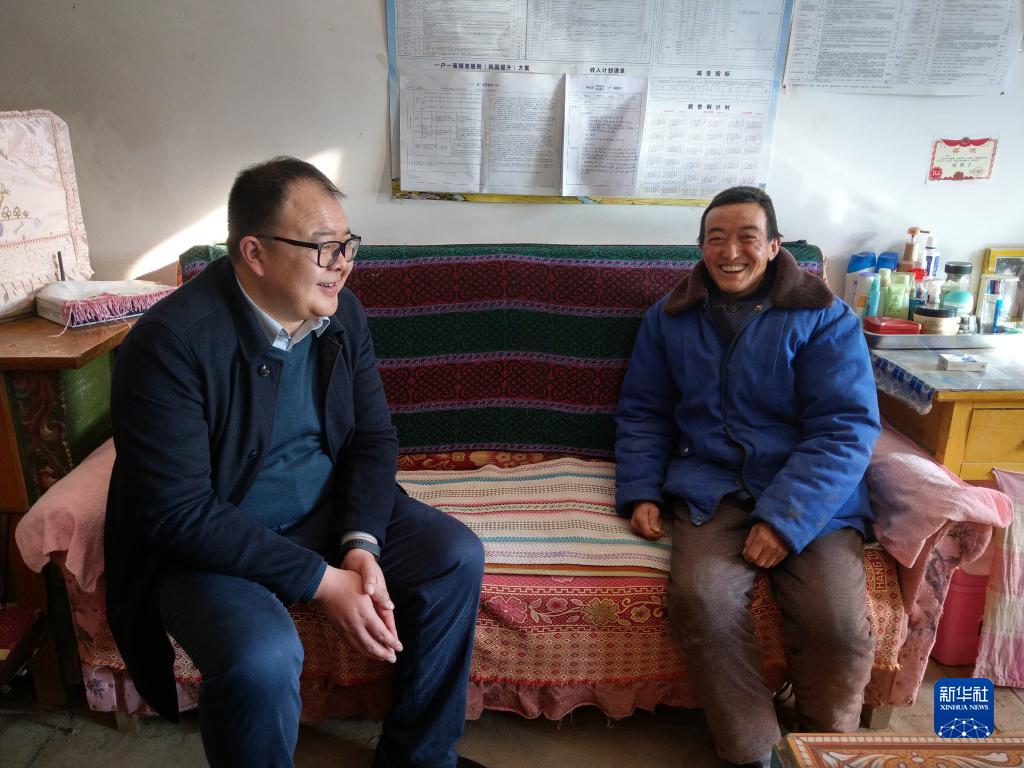 邱军(左)在乔川乡村民家中宣讲扶贫政策(2019年1月25日摄)。新华社发