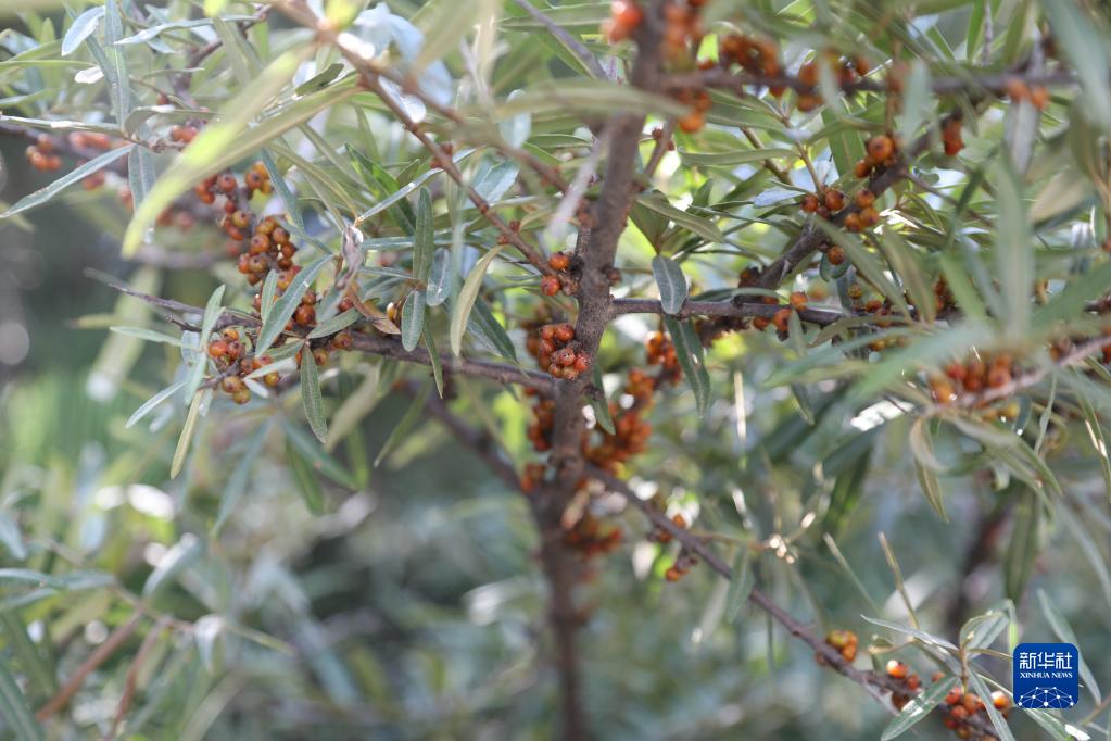 甘肃省庆阳市华池县的大山里,一簇簇沙棘树挂起了果,在起伏的黄土梁上恣意地绽放着红。
