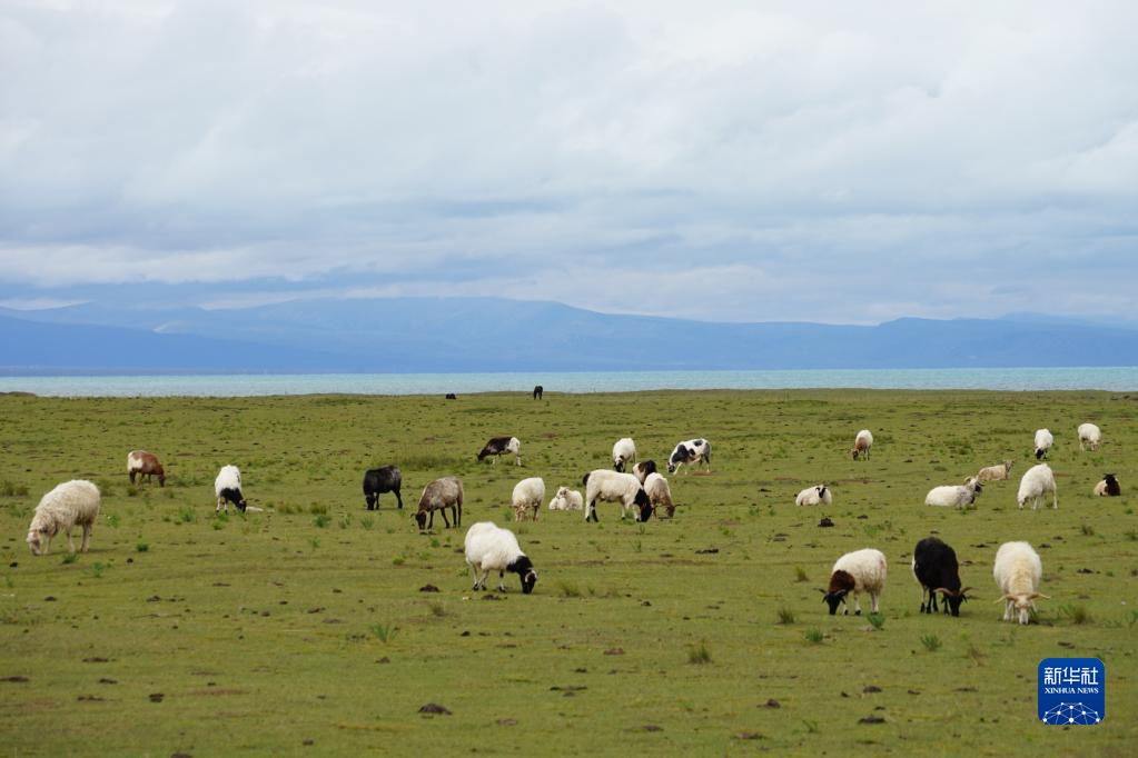 8月30日,雨后初晴,羊群在青海湖畔觅食。