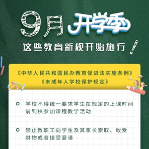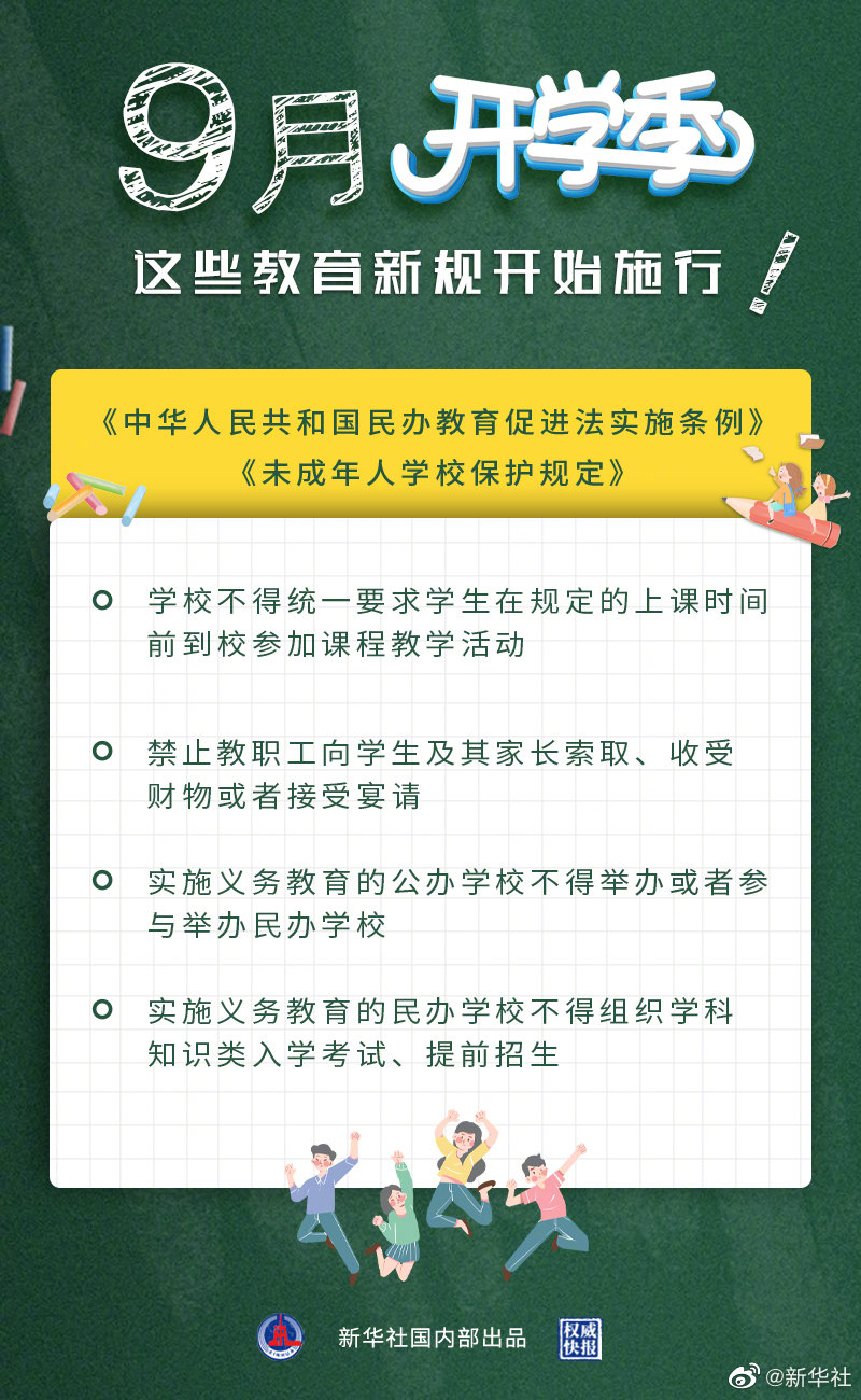 新修订的《中华人民共和国民办教育促进法实施条例》规定,民办学校要坚持公益性原则,明确实施学前教育、学历教育的民办学校享有与同级同类公办学校同等的招生权,对民办学校的组织与活动进行规范。《未成年人学校保护规定》要求,学校建立对学生欺凌、性侵害、性骚扰行为的零容忍机制,学校不得公开学生的考试成绩等学业信息,禁止义务教育学校占用寒暑假等时段组织学生集体补课。(记者白阳,海报设计张晨光)