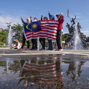 8月31日,在马来西亚吉隆坡,市民手举马来西亚国旗庆祝独立64周年。