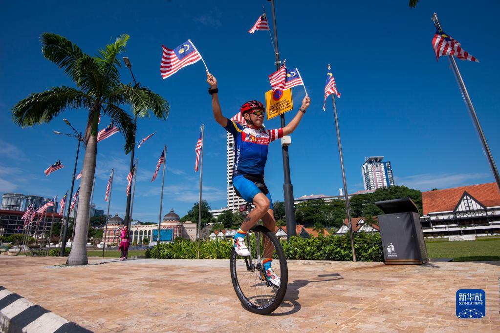 8月31日,在马来西亚吉隆坡,市民手举马来西亚国旗骑行庆祝独立64周年。