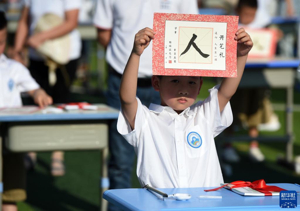 8月31日,在合肥师范学院附属实验小学,一年级新生展示自己在“开笔礼”仪式上用毛笔写的“人”字。