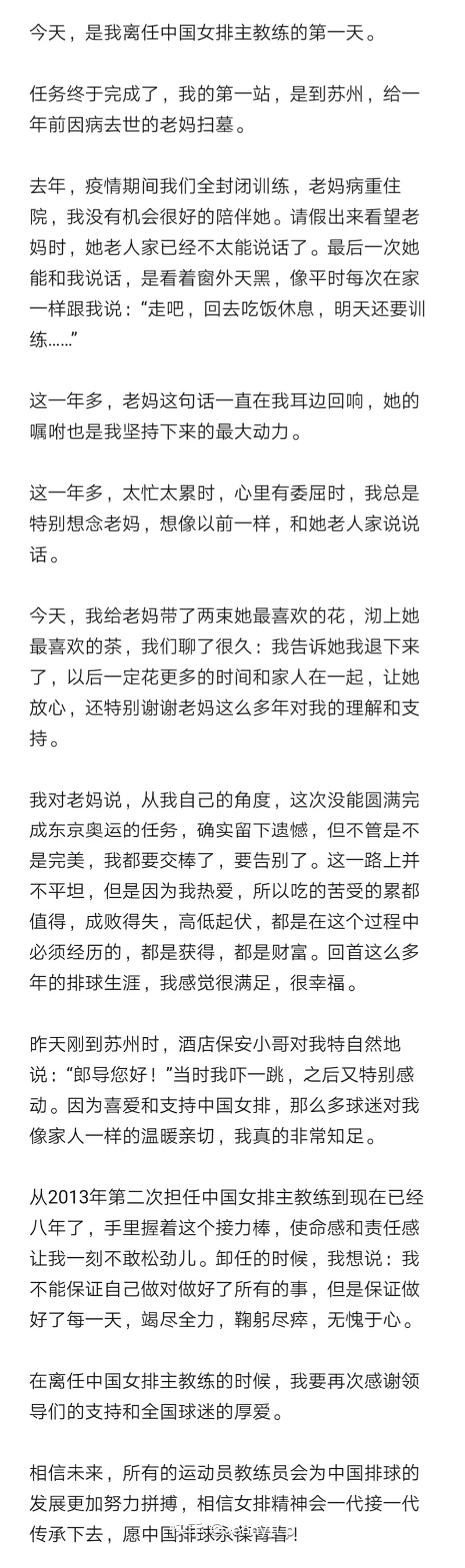 新华社北京9月1日电 9月1日,郎平在个人社交媒体上发文宣布自己已离任中国女排主教练一职。郎平的文章写道:“今天,是我离任中国女排主教练的第一天。”
