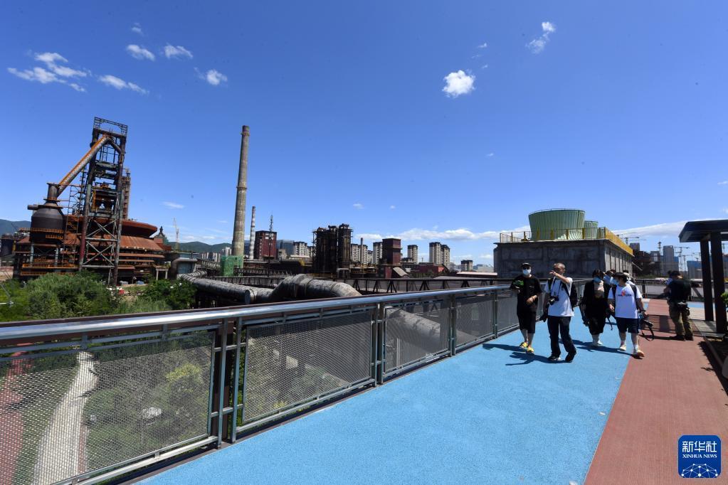 8月1日,参加2021年中国国际服务贸易交易会“9月,我在服贸会等你”系列宣传活动的受邀媒体记者行走在首钢园区内的“空中步道”。新华社记者 任超 摄