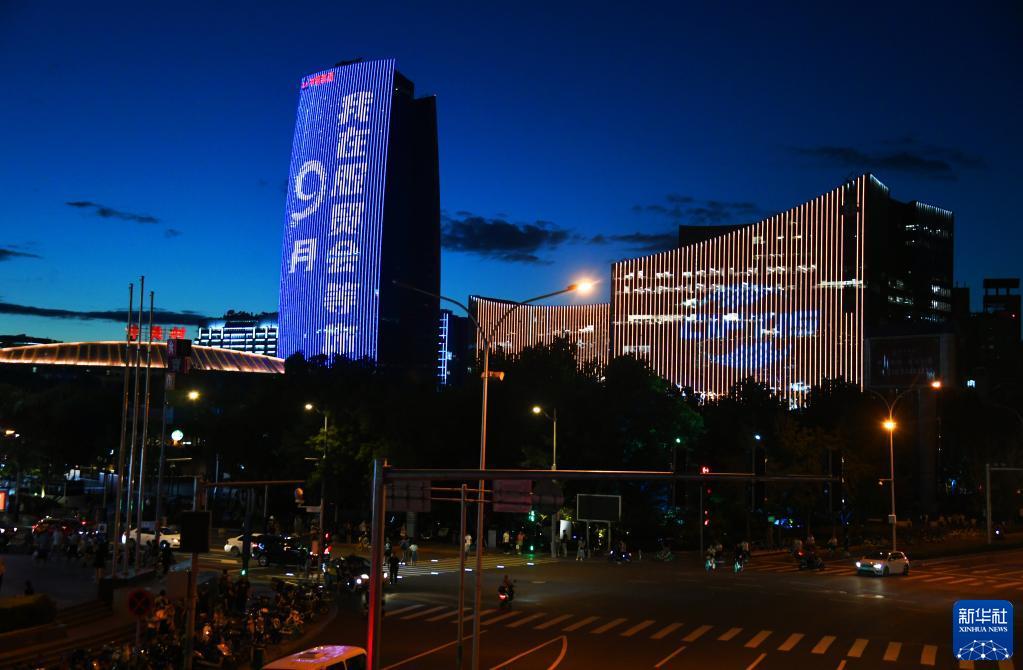 这是8月1日在北京市海淀区中关村大街拍摄的2021年服贸会户外灯光展示。新华社记者 任超 摄