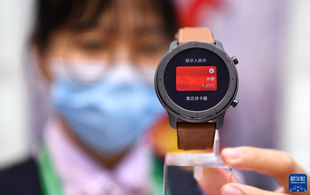 5月8日,在海南海口举行的首届中国国际消费品博览会上,工作人员展示一款数字人民币支付终端。新华社记者 郭程 摄