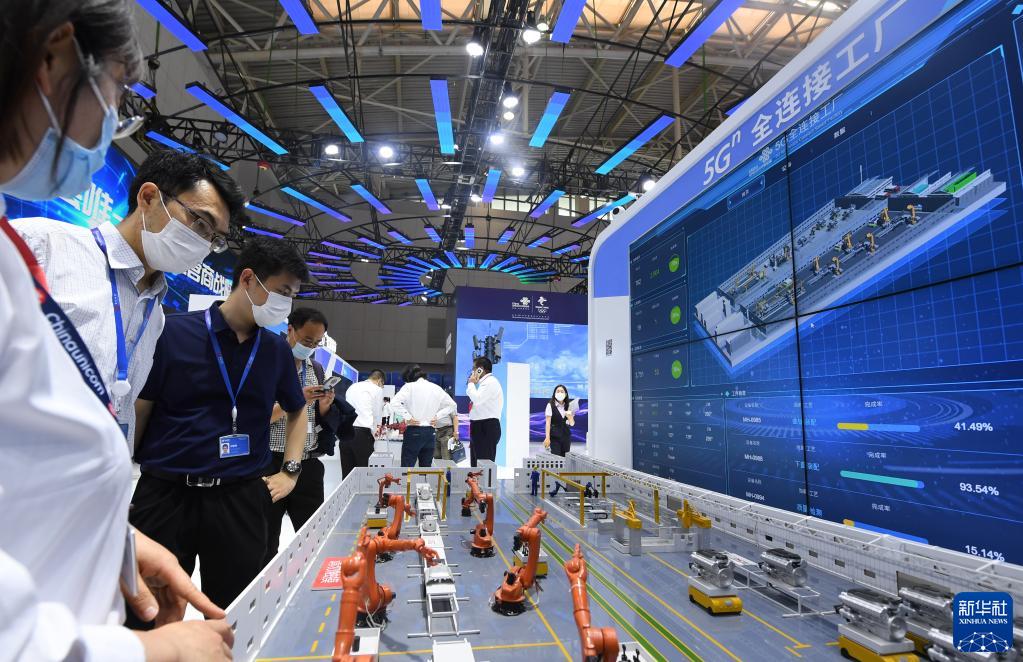 5月20日,在天津梅江会展中心举行的第五届世界智能大会上,参观者观看“全连接工厂”演示模型。新华社记者 赵子硕 摄