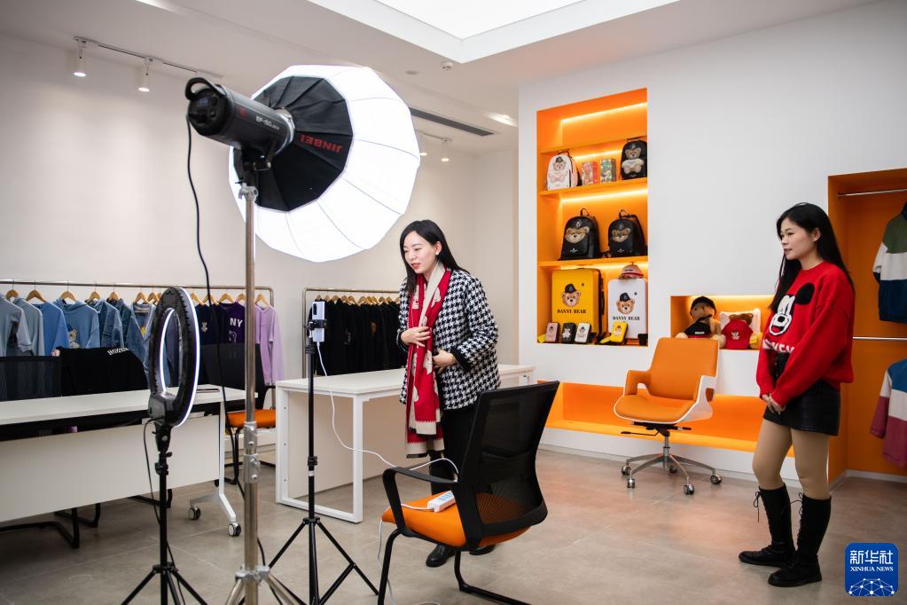 在中国(湖南)自由贸易试验区长沙片区的中非经贸合作促进创新示范园内,主播在中非直播电商孵化中心直播间里直播带货(2020年12月25日摄)。新华社记者 陈思汗 摄