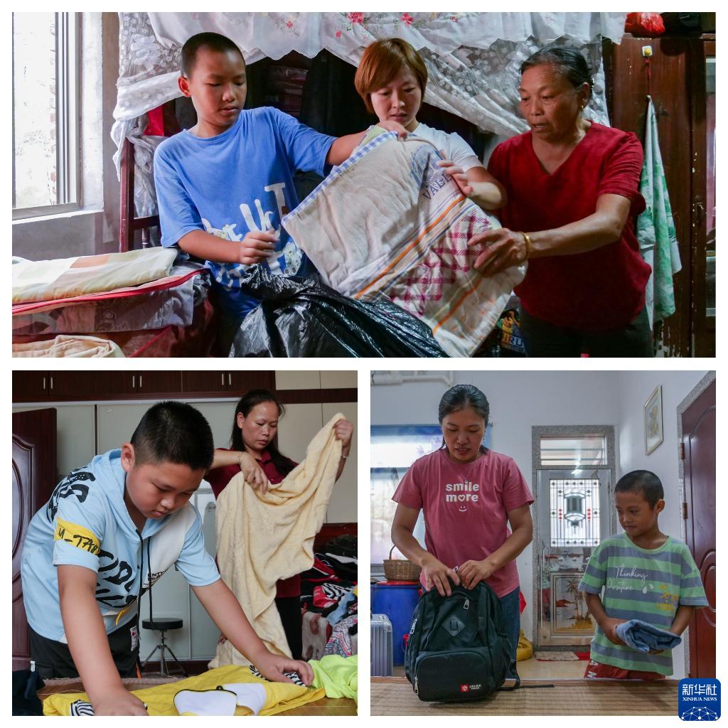 这是一张拼版照片,上图:8月31日,惠屿岛的六年级学生肖恩俊和家人一起收拾行李;左下:六年级学生肖昶清和妈妈收拾行李;右下:一年级学生肖晟佑和妈妈收拾行李。