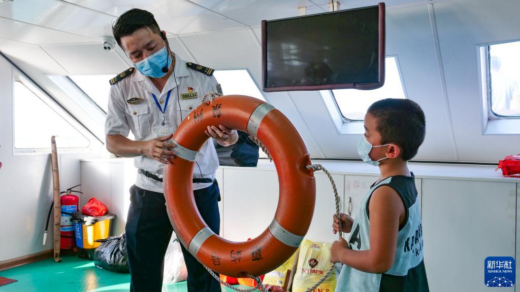 9月1日,泉港海事处的工作人员向惠屿岛学生介绍救生圈的使用。每逢开学,海事局工作人员都会为孩子们带来关于乘船安全和水上救护知识的“开学第一课”。