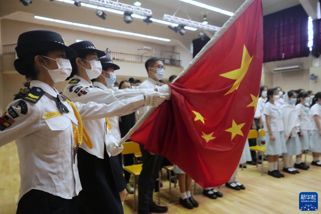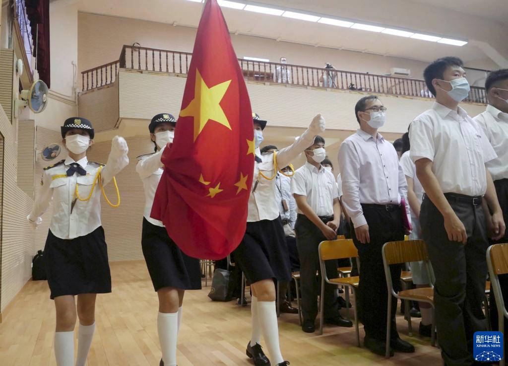 9月1日,在香港教育工作者联会黄楚标中学,五星红旗在学校礼堂冉冉升起。新华社记者 王申 摄