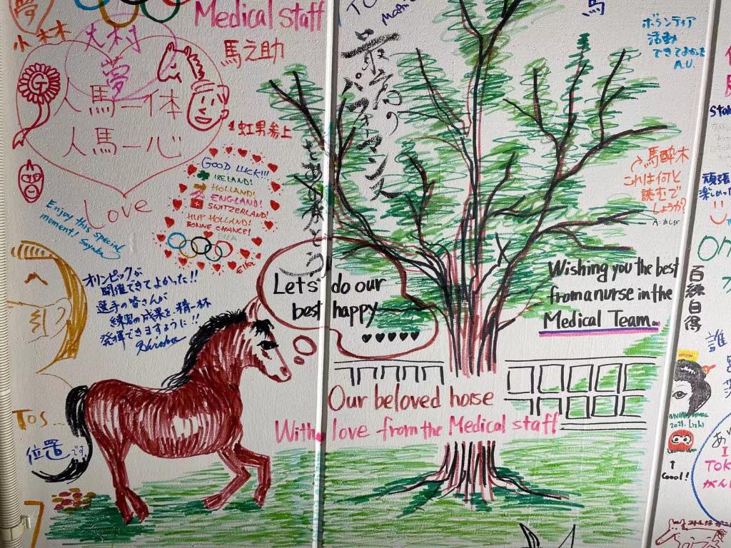墙上的画都与两个奥运有关,除了吉祥物、五环和三色弧形标志外,墙上画着各种各样马的形象,有些一看就很有水平,不得不感叹日本是动漫大国。