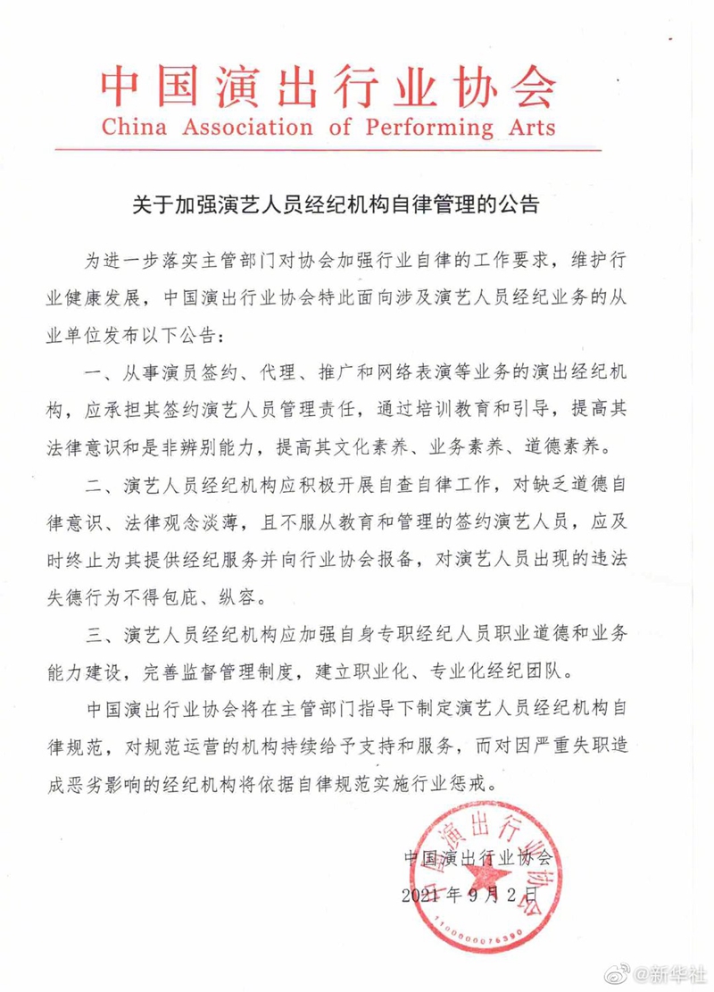 中国演出行业协会9月2日发布自律公告,强调艺人经纪机构应承担艺人教育管理责任,应开展自查自律,对于缺乏底线意识、不服从约束和引导的艺人,应终止为其提供经纪服务。严重失职失责、纵容违法失德行为的经纪机构今后也将受到行业自律惩戒。(记者白瀛、王鹏)