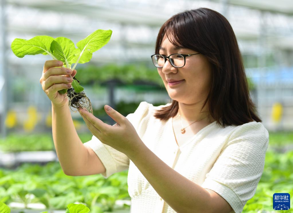 在广东江门开平市国家现代农业示范区内,谭慧敏在鱼菜共生生产基地查看“水口白菜”生长情况(9月2日摄)。新华社记者 邓华 摄