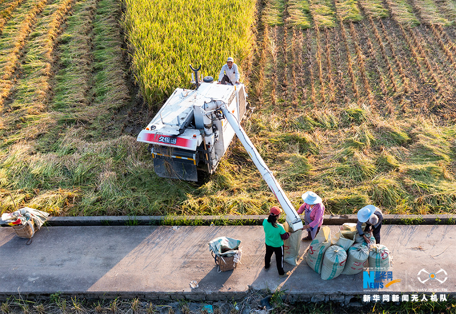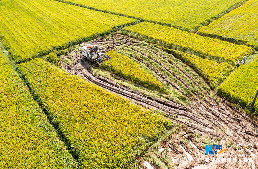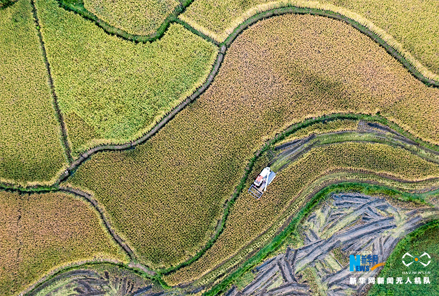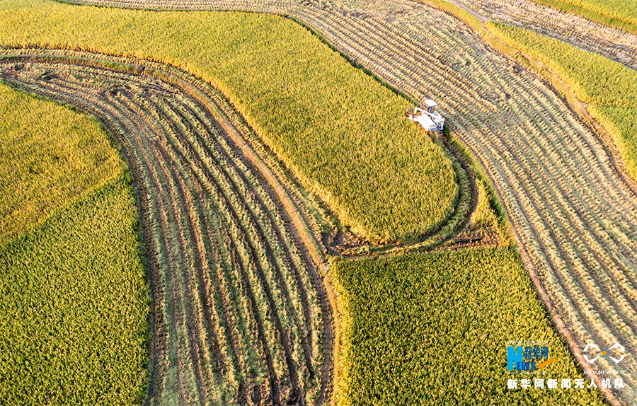 又是稻谷飘香时节!近段时间,在重庆市南川区的田间地头,金灿灿的稻浪随风翻滚,收割机来回穿梭,金黄的稻田里热闹的机收场景随处可见,农民抓住晴好天气忙秋收,确保水稻颗粒归仓。新华网发(甘昊旻 摄)