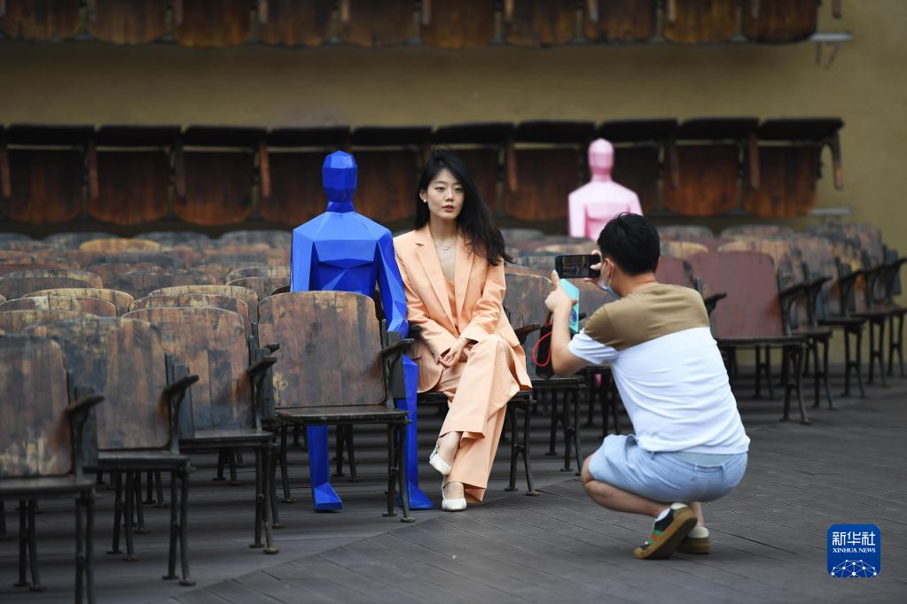 9月3日,游客在“只有河南·戏剧幻城”内参观留影。