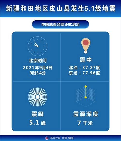 新华社乌鲁木齐9月4日电(记者周晔、顾煜)4日09时54分,新疆和田地区皮山县发生5.1级地震。当日零时起,新疆喀什地区叶城县、和田地区皮山县发生多次地震,目前最大震级为5.1级,当地震感明显,暂无人员伤亡和财产损失报告。