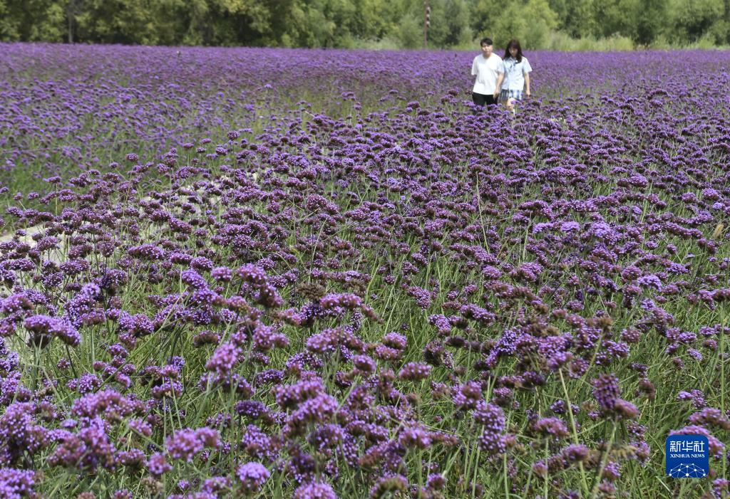 9月4日,游客在永靖县刘家峡镇黄河花堤上赏花。
