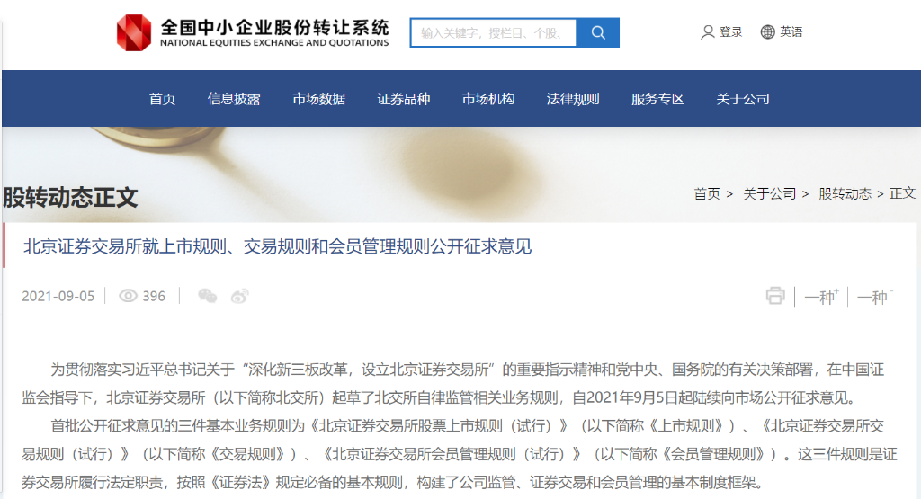 5日,北京证券交易所三大基本业务规则——上市规则、交易规则和会员管理规则开始征求意见。