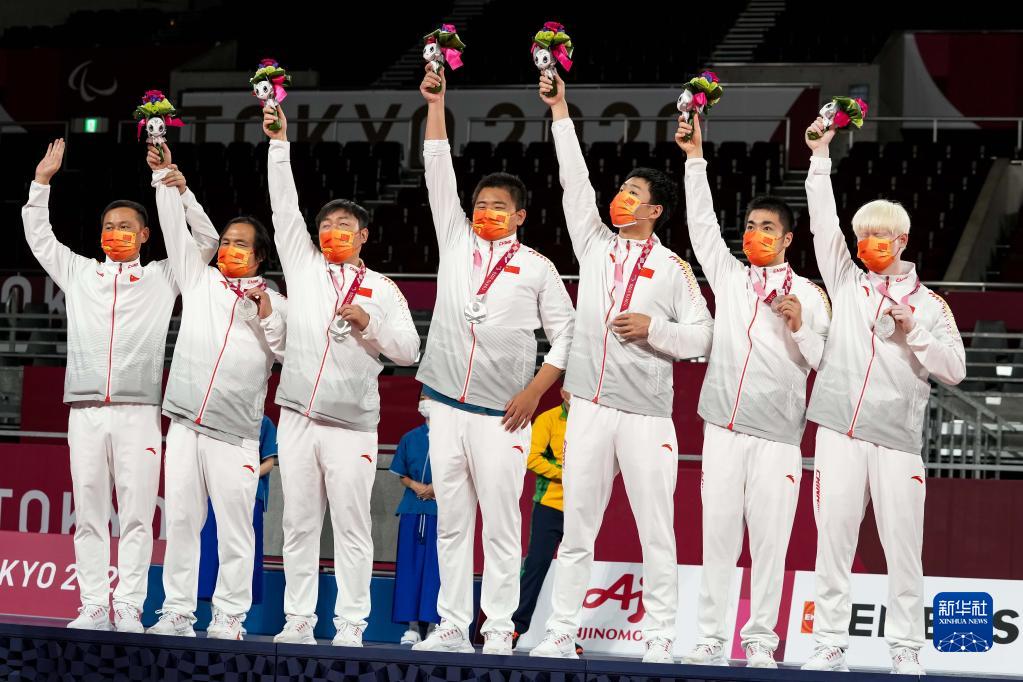 9月3日,摘得银牌的中国队在东京残奥会男子盲人门球颁奖仪式上。新华社记者 张铖 摄
