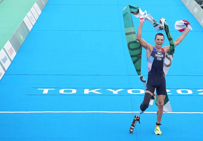 8月28日,法国选手亚历克西斯在冲线时向观众致意。当日,东京残奥会铁人三项男子PTS4级别决赛中,他获得金牌。新华社记者 熊琦 摄