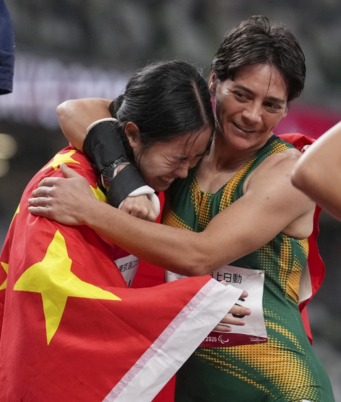 8月31日,在东京残奥会女子400米T37级决赛中,中国选手蒋芬芬夺冠。赛后,季军南非选手詹姆斯(右)搂着蒋芬芬向其致意。新华社记者 胡虎虎 摄