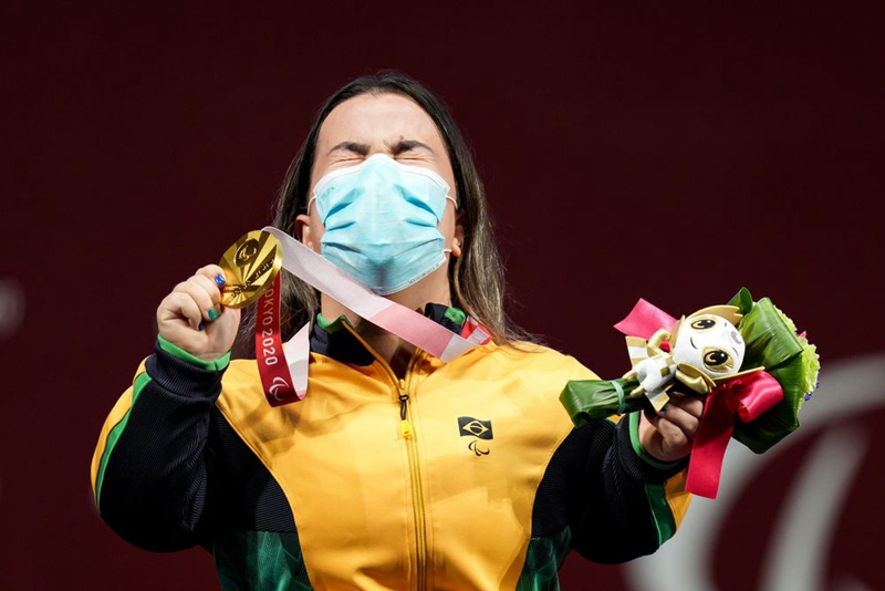 8月29日,巴西选手玛丽安娜·丹德列亚在颁奖仪式上。当日,在东京残奥会举重女子73公斤级决赛中,她获得金牌。新华社记者 张铖 摄