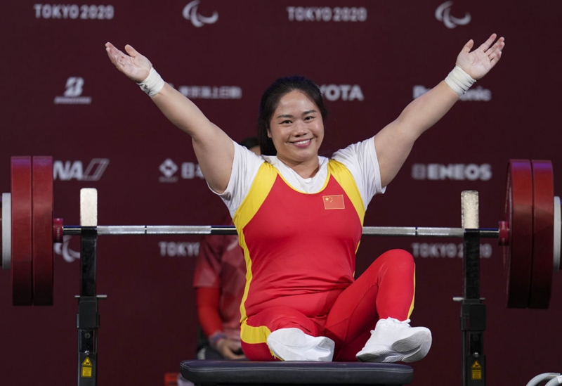8月28日,中国选手谭玉娇在东京残奥会举重女子67公斤级决赛中庆祝,最终她夺得冠军。新华社记者 胡虎虎 摄