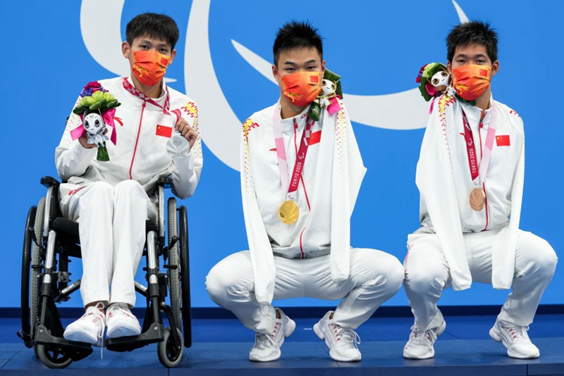 8月30日,在东京残奥会游泳男子50米仰泳S5级颁奖仪式上,郑涛(中)、阮靖淞(左)和王李超在颁奖仪式上合影。新华社记者 张铖 摄