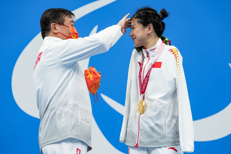 8月30日,在东京残奥会游泳女子50米仰泳S5级颁奖仪式上,领队凡虹(左)帮助卢冬摘下口罩、整理头发。 新华社记者 张铖 摄