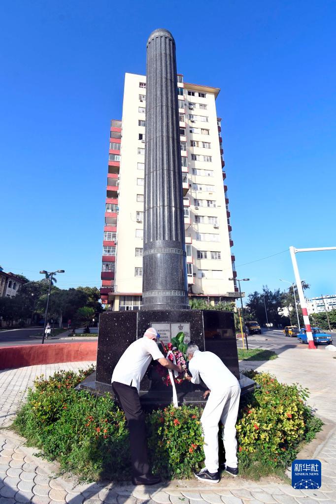 9月4日,在古巴首都哈瓦那革命广场区的“旅古华侨协助古巴独立纪功碑”前,曾赴华留学的古巴退役飞行员和机修师敬献花圈。新华社发(华金·埃尔南德斯 摄)