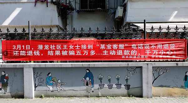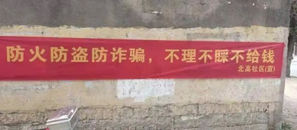 拉横幅。一场创意无限的反诈宣传横幅“大赛”在街头巷尾热热闹闹地上演。