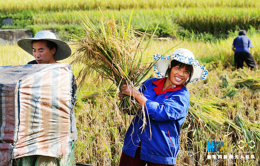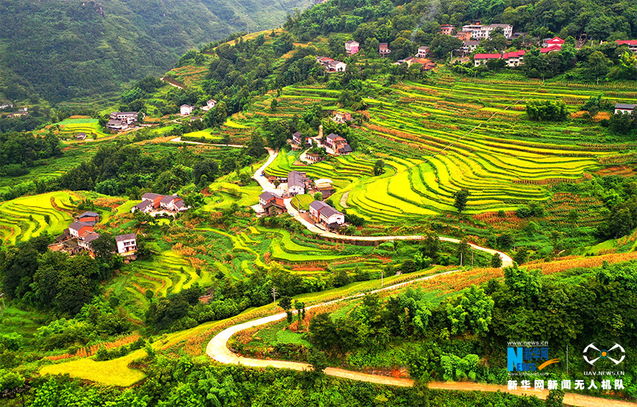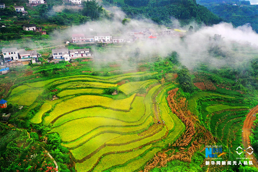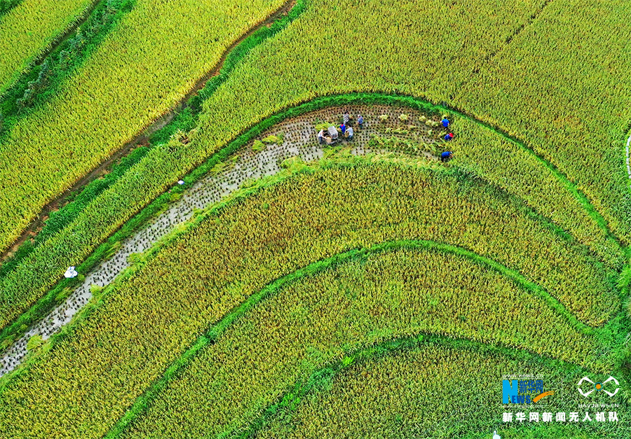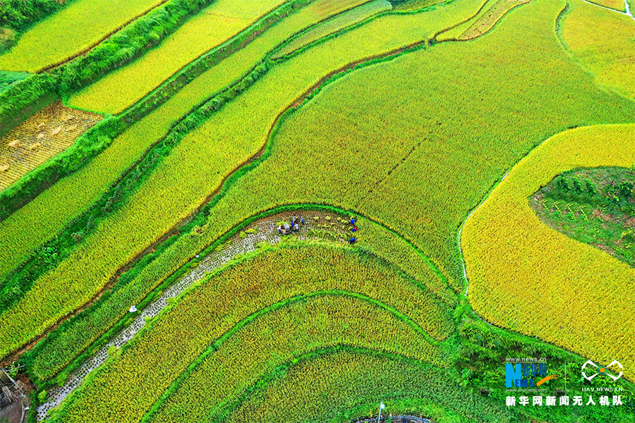 秋收时节,重庆万盛经开区黑山镇天星村水稻成熟进入收割季,农民抓住晴好天气抢收水稻,确保颗粒归仓。图为无人机视角下的天星村稻田。新华网发(曹永龙 摄)