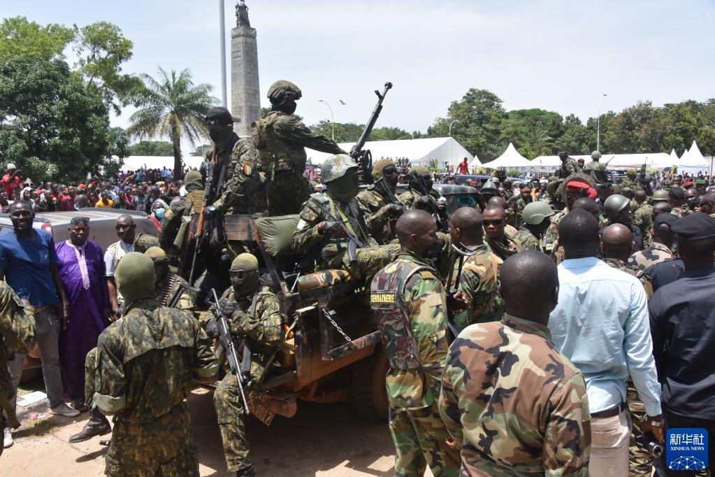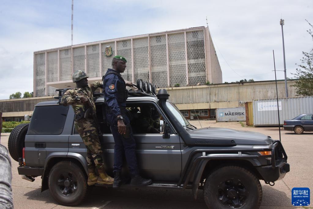 9月6日,政变军队在几内亚科纳克里人民宫外维持秩序。新华社发