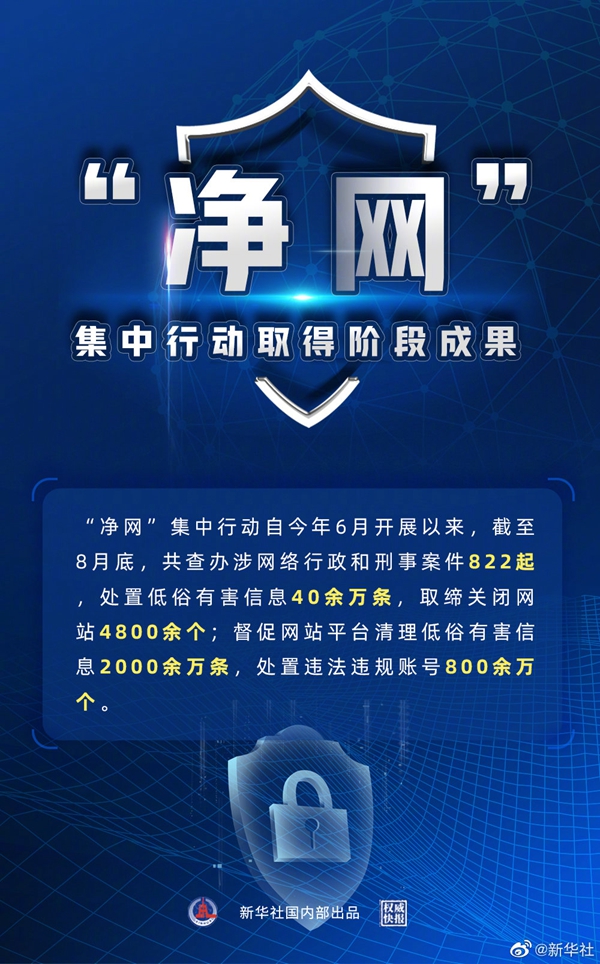 新华社北京9月7日电(记者史竞男、王鹏)按照全国“扫黄打非”工作小组部署,中央宣传部、中央网信办、工业和信息化部、公安部、文化和旅游部、国家广播电视总局今年6月起共同开展的“净网”集中行动,取得阶段成效。据不完全统计,6月至8月底,执法监管部门共查办涉网络行政和刑事案件822起,处置低俗有害信息40余万条,取缔关闭网站4800余个;督促网站平台清理低俗有害信息2000余万条,处置违法违规账号800余万个。