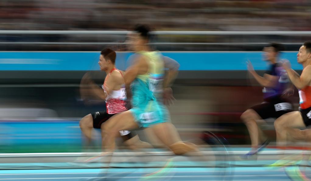 苏炳添(左)、谢震业(左二)在天津全运会百米比赛中。 (新华社记者 曹灿 摄)