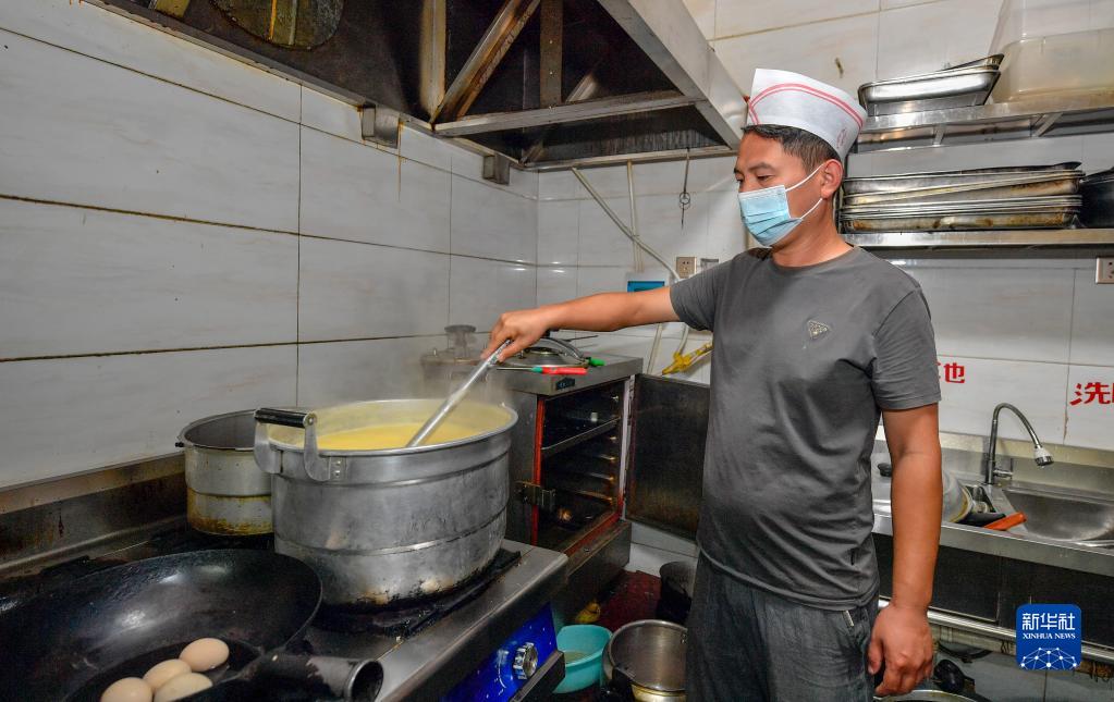 在天津市宝坻区黄庄镇小辛码头村,李超为客人准备早餐(9月3日摄)。新华社记者 孙凡越 摄