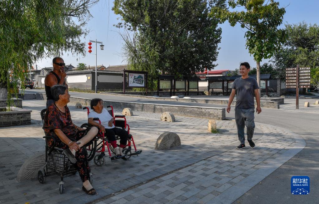 在天津市宝坻区黄庄镇小辛码头村,担任村委委员的李超(右一)在巡视时与村民交流(9月2日摄)。新华社记者 孙凡越 摄