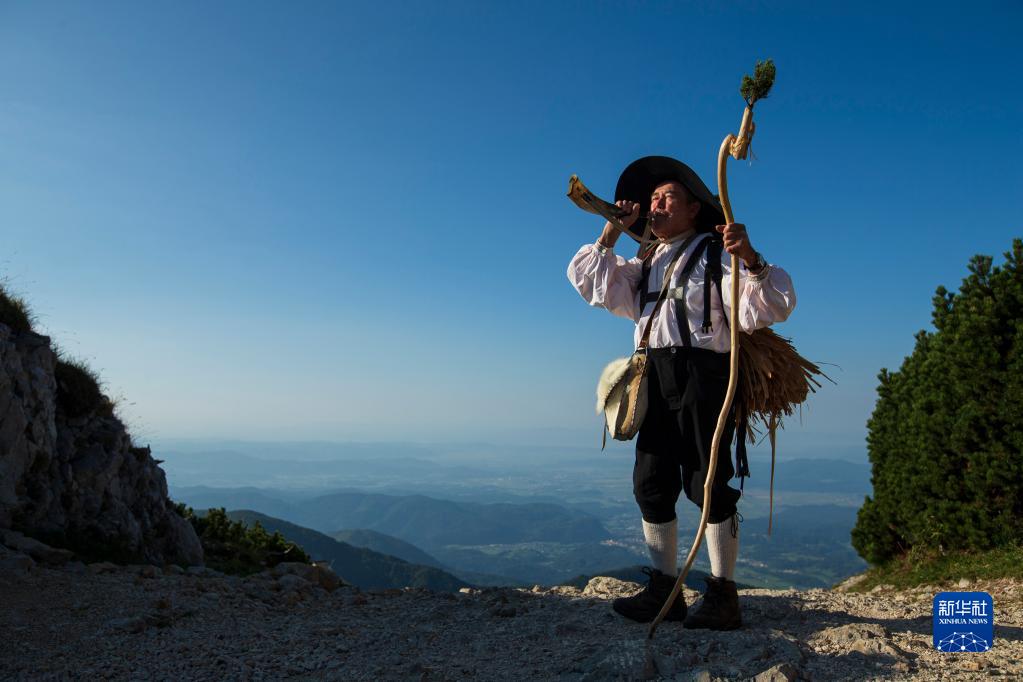 9月8日,斯洛文尼亚维利卡普拉尼那高地的老牧民彼得身着传统服饰在吹牛角号。