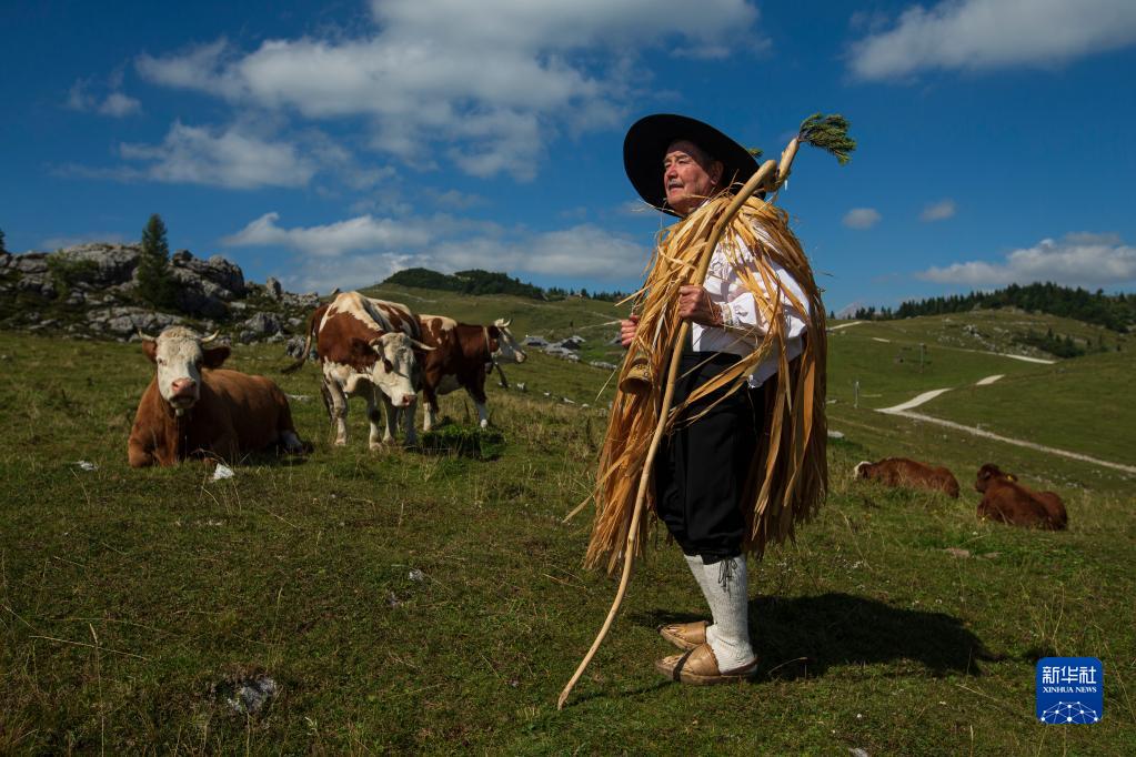 9月8日,斯洛文尼亚维利卡普拉尼那高地的老牧民彼得身着传统服饰在牧场上远眺。