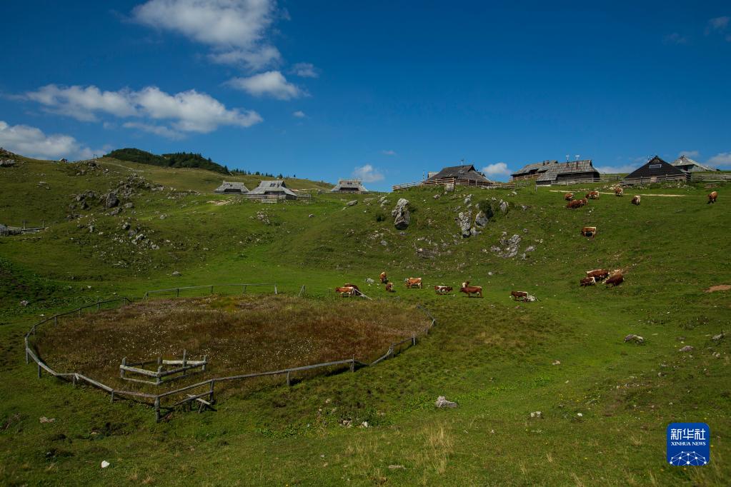 这是9月8日在斯洛文尼亚维利卡普拉尼那高地牧民定居点拍摄的传统木屋和奶牛。