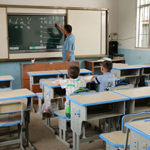 一张长方形的条桌,就是高庆周的讲台。桌子上的油漆已经脱落,摆放着课本和学生作业本。全校仅有8名学生,几乎都是留守儿童,其中一年级2名、二年级6名。
