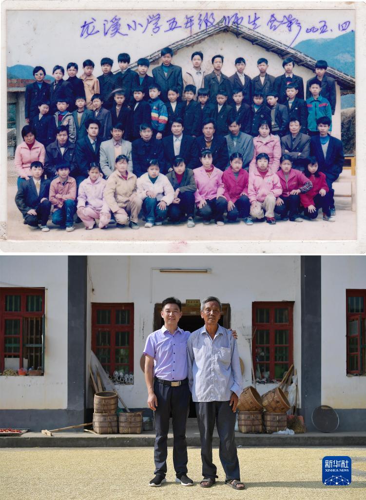 拼版照片:上图为朱森林(一排左一)小学时的合影,他的老师方李长在第二排右五位置(资料照片);下图为2021年8月31日,朱森林和已经退休的方李长在龙溪村合影(新华社记者 彭昭之 摄)。