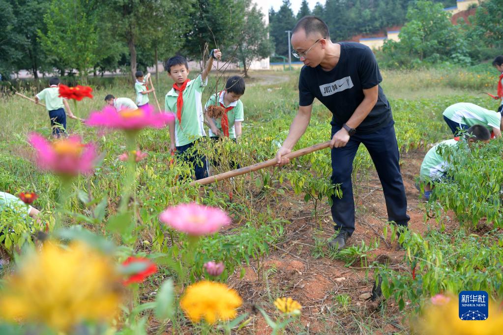 在江西宜春市袁州区寨下镇中心小学劳动实践基地,校长殷大福带着学生们在蔬菜地里松土(9月1日摄)。