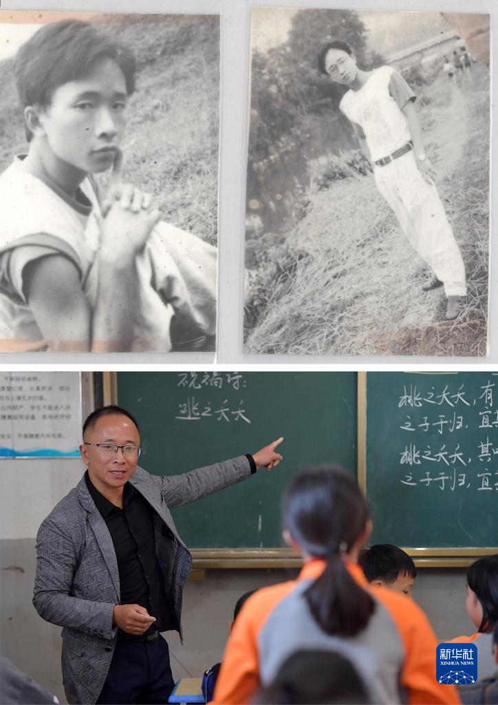 拼版照片:左上、右上图为殷大福刚参加工作时的照片(资料照片);下图为2020年11月9日,殷大福在宜春市袁州区寨下镇中心小学给学生上课(新华社记者 彭昭之 摄)。