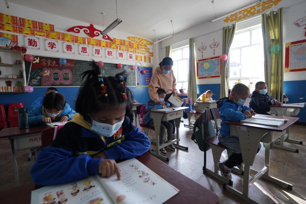 新疆和静县巴音布鲁克寄宿制学校教师赵晓雪在给学生们上课(9月9日摄)。新华社记者宿传义 摄