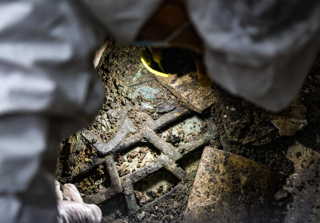 9月2日,在四川德阳广汉市三星堆遗址,考古人员在7号“祭祀坑”内清理“玉板”。新华社记者 王曦 摄