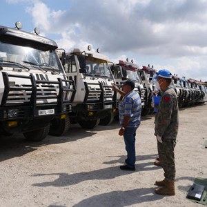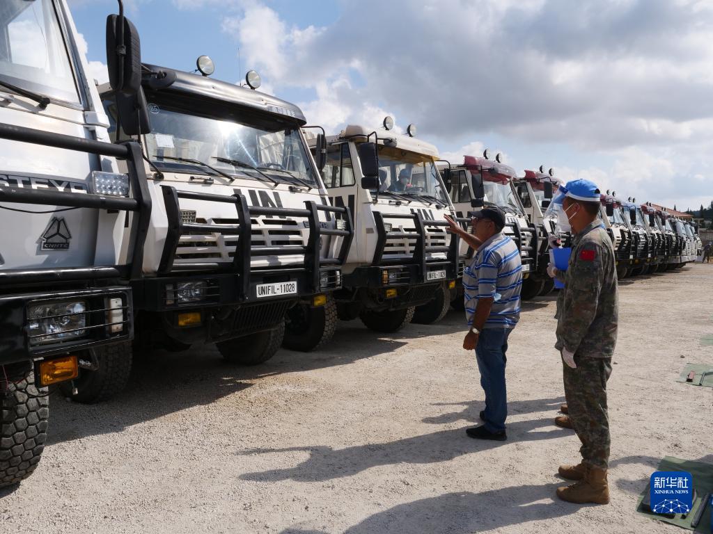9月10日,在黎巴嫩南部辛尼亚村中国营,联黎部队司令部核查组成员核查中国维和多功能工兵分队的车辆。新华社发(梁裕源摄)