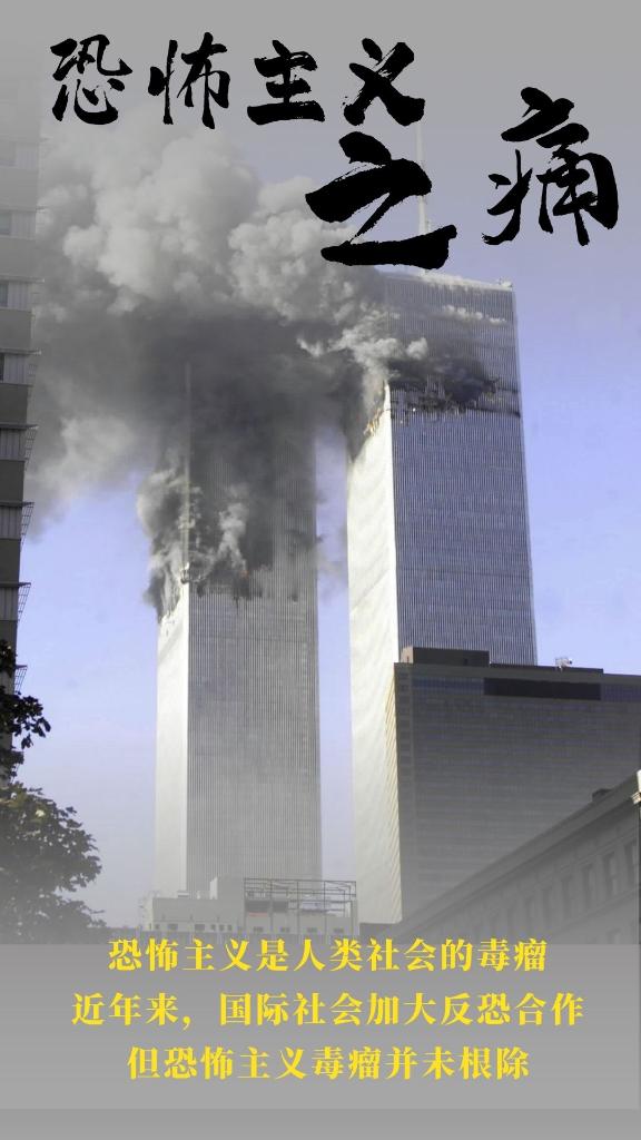 2001年9月11日上午,被恐怖分子劫持的两架客机先后撞向美国纽约曼哈顿世界贸易中心两座大楼,引发剧烈爆炸。烈焰熊熊,浓烟滚滚,世贸双塔轰然倒塌,无辜生命消逝。